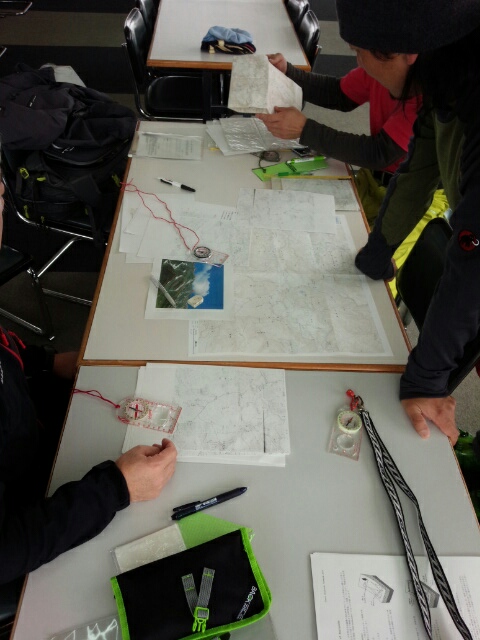 地図の見かた、使い方、コンパスの使い方、高度計の使い方などを座学