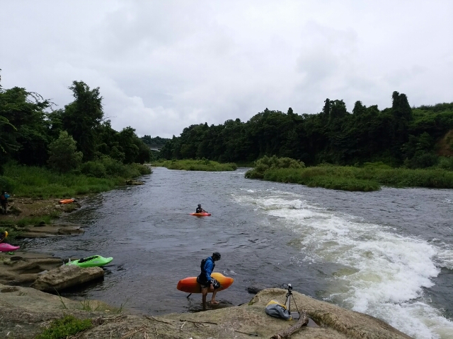 はじめは草陰静水でロール、カートホイル、小屋横ウェーブでフロントサーフィン
